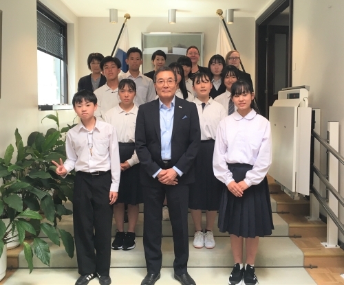 Suurlähettilään virka-asunnolla vieraili kymmenen oppilasta Izumon kaupungista Japanista. Ryhmä yläaste- ja lukio-opiskelijoita on Suomessa käymässä viikon ajan, jonka aikana he vierailevat ystävyyskaupungissaan Kalajoella. Kalajoella oppilaat tutustuvat suomalaiseen kouluun ja yöpyvät suomalaisissa perheissä.