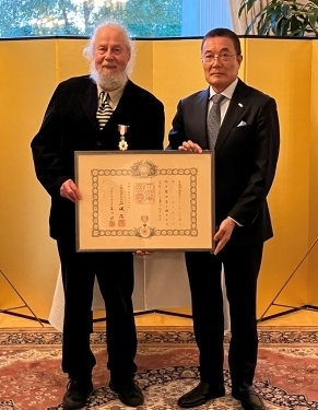 Japanin keisarin keväällä 2025 myöntämän kunniamerkin jakotilaisuus (Kai Nieminen, Nousevan auringon ritarikunnan kunniamerkki kultaisin ja hopeisin sätein)