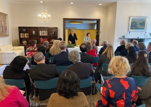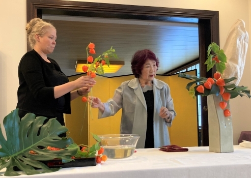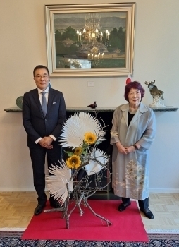 Suurlähettilään residenssissä järjestettiin 22. syyskuuta ikebana-näytös, jossa kukka-asetelmia teki Koka Fukushima, Sogetsu-koulukunnan päämajan opettaja (master instructor) ja Sogetsu-säätiön johtaja. Fukushima on pitänyt työpajoja ja näyttelyitä yli 40 maassa ja vieraillut useasti myös Suomessa vuodesta 1988 lähtien edistääkseen sogetsu-koulukunnan opetusta. Monet Suomessa toimivista sogetsu-ikebana-opettajista ovat Fukushiman oppilaita tai Fukushiman oppilaiden oppilaita. Ikebana-näytöksessä Fukushima näytti kahdeksan asetelman luomisprosessin ja kertoi yleisölle asettelun periaatteista, kuten yhteen kietoutuvien materiaalien luomien linjojen tärkeydestä, maljakon vaikutuksesta sekä eri välineiden käytöstä. Yleisö vaikuttui syvästi valmiista ikebana-asetelmista, jotka yhdistivät perinteistä ja modernia kauneutta. Sydämellinen kiitos, Koka Fukushima! Haluamme myös kiittää Liisa “Ranka” Nurmista (riji-arvon opettaja) ja kaikkia näytöksessä avustaneita heidän tuestaan.