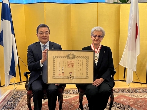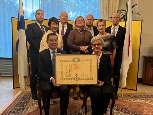マルケッタ・フォルセル氏は、長年にわたり日フィンランド間の文化交流に尽力してこられ、2018年から日本フィンランド協会会長をつとめておられます。また、いけばなインターナショナル・ヘルシンキ支部長としてもご活躍です。これらの活動を通じ、日フィンランド間の友好親善及び相互理解の促進に寄与した功労が認められ、旭日中綬章を受章しました。