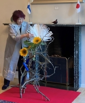 9月22日、福島光加先生(草月流本部講師(一財)草月会理事 )による生け花デモンストレーションを大使公邸にて実施しました。福島先生はこれまで40カ国以上でワークショップや展覧会を開催されていますが、1988年頃からフィンランドを繰り返し訪問され、草月流の指導を続けられています。フィンランドで活躍されている草月流教師の多くの方は福島先生の弟子や孫弟子でいらっしゃいます。今回のデモンストレーションでは、8種類の生け花の制作過程を披露しながら、素材が織りなす線の重要性や花器のもつ影響、道具の使い方など、草月流の流儀について説明されました。伝統と現代の美を融合させた生け花が次々と完成したことに、すべての観客が深い感銘を受けました。福島先生に心より感謝申し上げます。また、デモンストレーションにあたりサポート頂いたリーサ・ヌルミネン(蘭加)理事及び関係の皆さまにも御礼申し上げます。