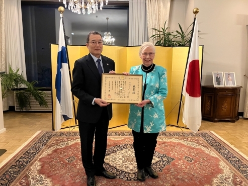 ピルヨ=リーッタ・クーシッコさんが、日本とフィンランドの相互理解の促進における功績により、外務大臣表彰を受賞しました。2月23日に岡田大使より、表彰状及び副賞が授与されました。