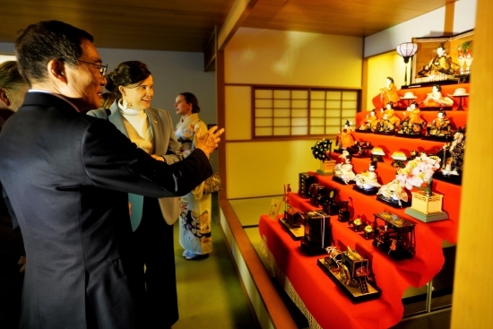 タルヴィティエ科学・文化相にひな祭りについて説明する岡田大使