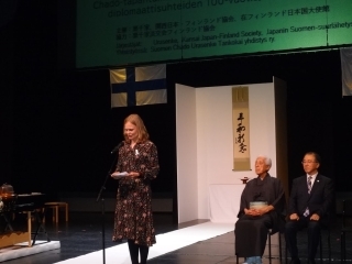 日フィンランド外交関係樹立100周年を記念して,裏千家千玄室大宗匠が当地を訪問され,10月11日(金),アレクサンテリ劇場において,裏千家,関西・日本フィンランド協会及び当館共催による記念の茶道行事が開催されました。当日は各界要人,友好団体関係者等を含め,多数の一般客が集まる盛会となりました。